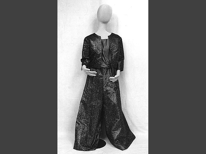 Aftonpyjamas i 3 delar, bestående av blus, byxor och jacka av bolerotyp. Blusen av klarblått siden, ärmlös och med rund halsringning, knytband av tyget i ena sidan. Byxor och jacka av blått metallglänsande konstfibermaterial med svagt randig effekt, slät botten i lös tuskaft med invävda olika långa smala metallskiftande band som ger tyget ett luddigt utseende. Jackan med halvlång ärm och rundad halsringning, fodrad med klarblått siden. Byxorna med mycket vida ben och foder av ljusblått siden samt extra styvnad av svart preparerad gasväv. Blixtlås i vänster sida.