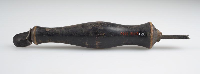 Fummel med svarvat träskaft och läderrem för upphängning. Verktyg för gättning av vax på sula och gelänk. Gelänk - ett stycke läder (eller pressad papp) som lägges i hålfoten mellan bindsulan och yttersulan för att göra detta parti styvt.