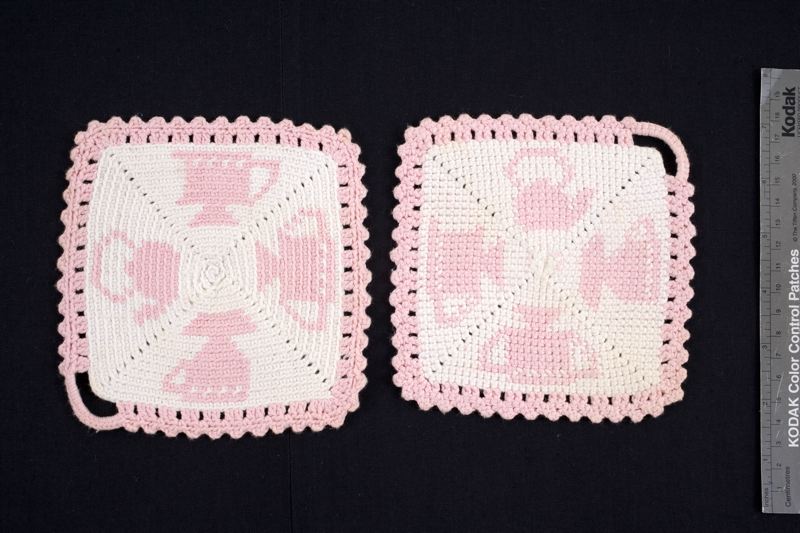 Handvirkade i rosa och vit bomullsgarn, vit botten med rosa mönster ochkant.