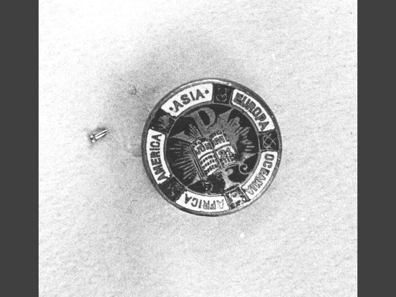 Metallmärke/dubbelknapp av mässing, emaljerad. KFUMS:s internationella märke, dubbelknapp. Blå och vit emalj på mässing med texten "AFRICA AMERICA ASIA EUROPA OCEANIA". Stämpel på baksidan BUREAU CENTRAL OU COMIT+ UNIVERSEL GEN+VE.