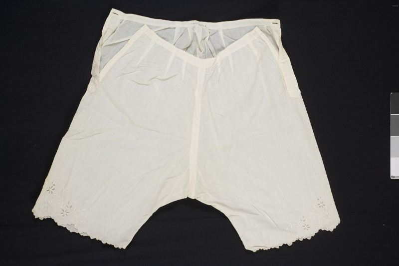 Byxor, vid modell, långa ben med vitbroderi. Märkt E L i midjan.Sprund med knäppning i båda sidorna. Maskinbrodyr i bensluten.