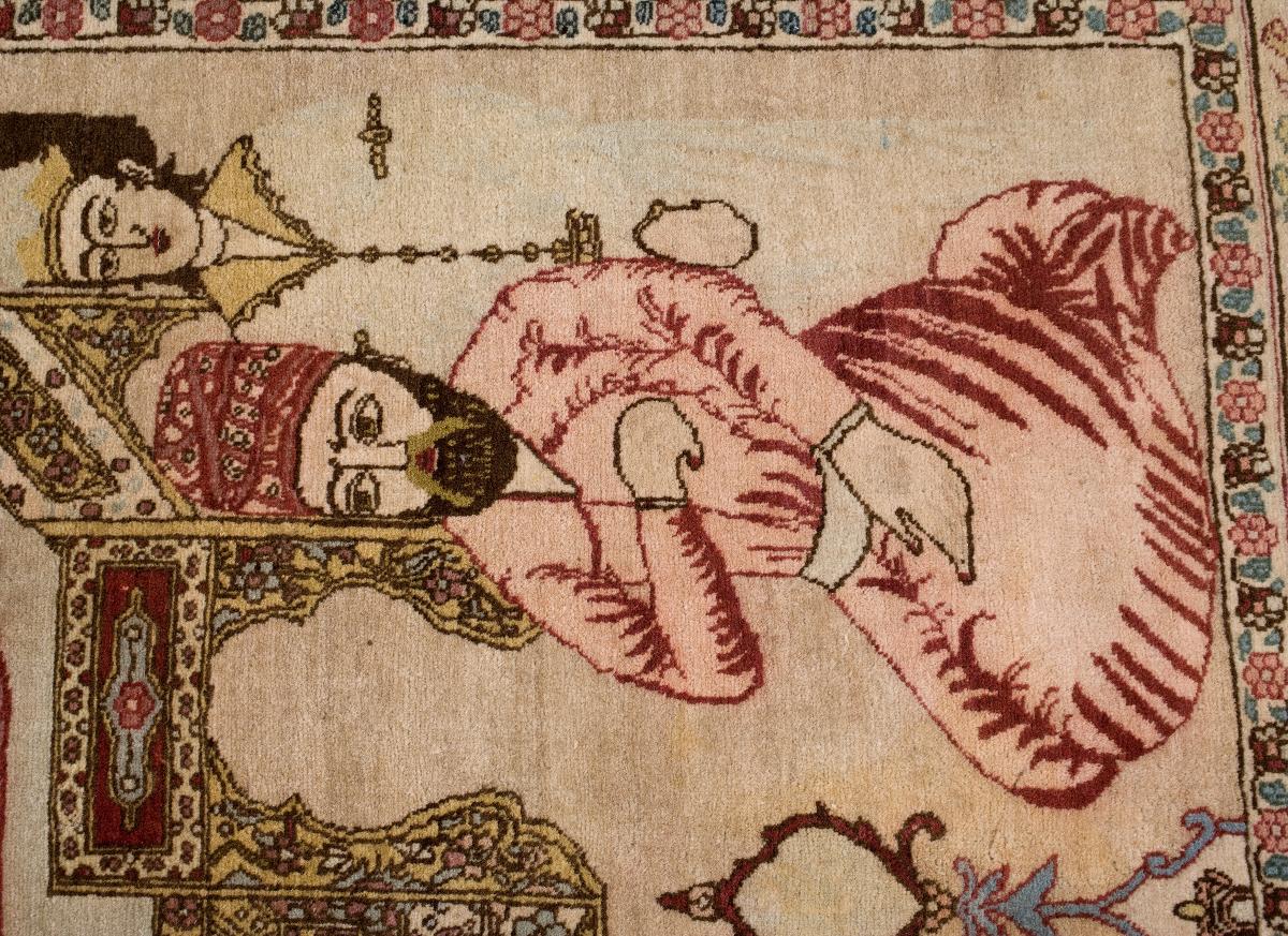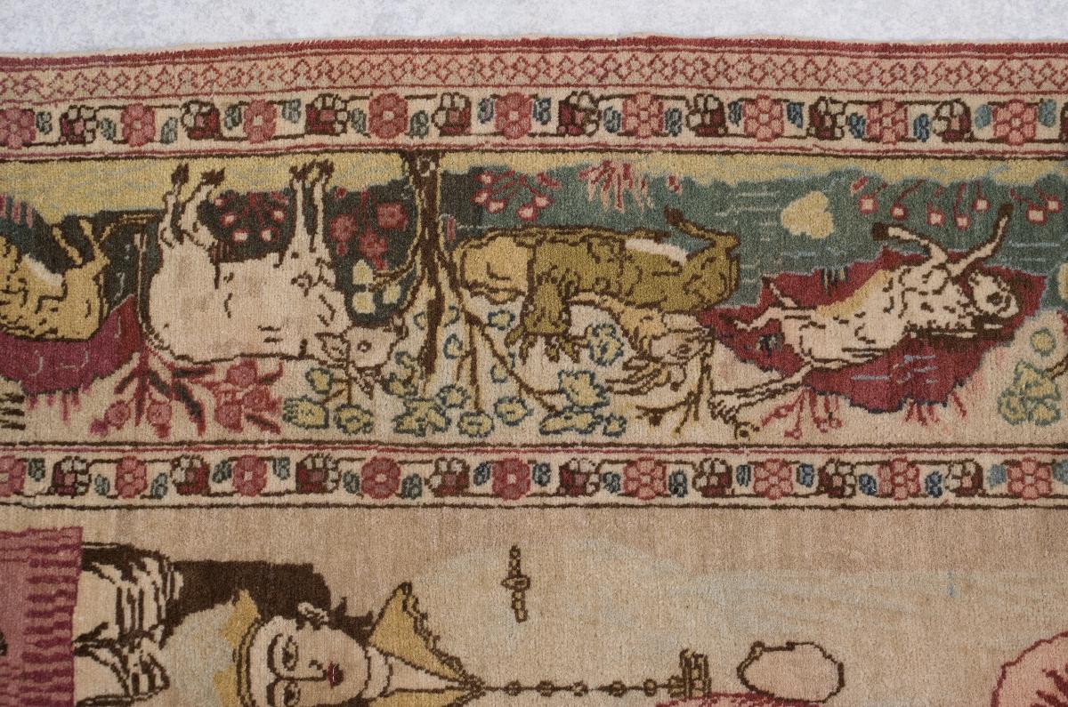 Mattan kantas av en bård med olkia djuravbildningar. Centralmotiv en sittande man, sultan(?) flankerade av två män i en palatsliknande byggnad. Nedanför ytterligare två män. Varp av vitt bomullsgarn, 14 tr/cm. Inslag av vitt bomullsgarn , 2 tr mellan varje knutrad. Senneh-knutar, 5 st/ cm. Knutar av ullgarn.
