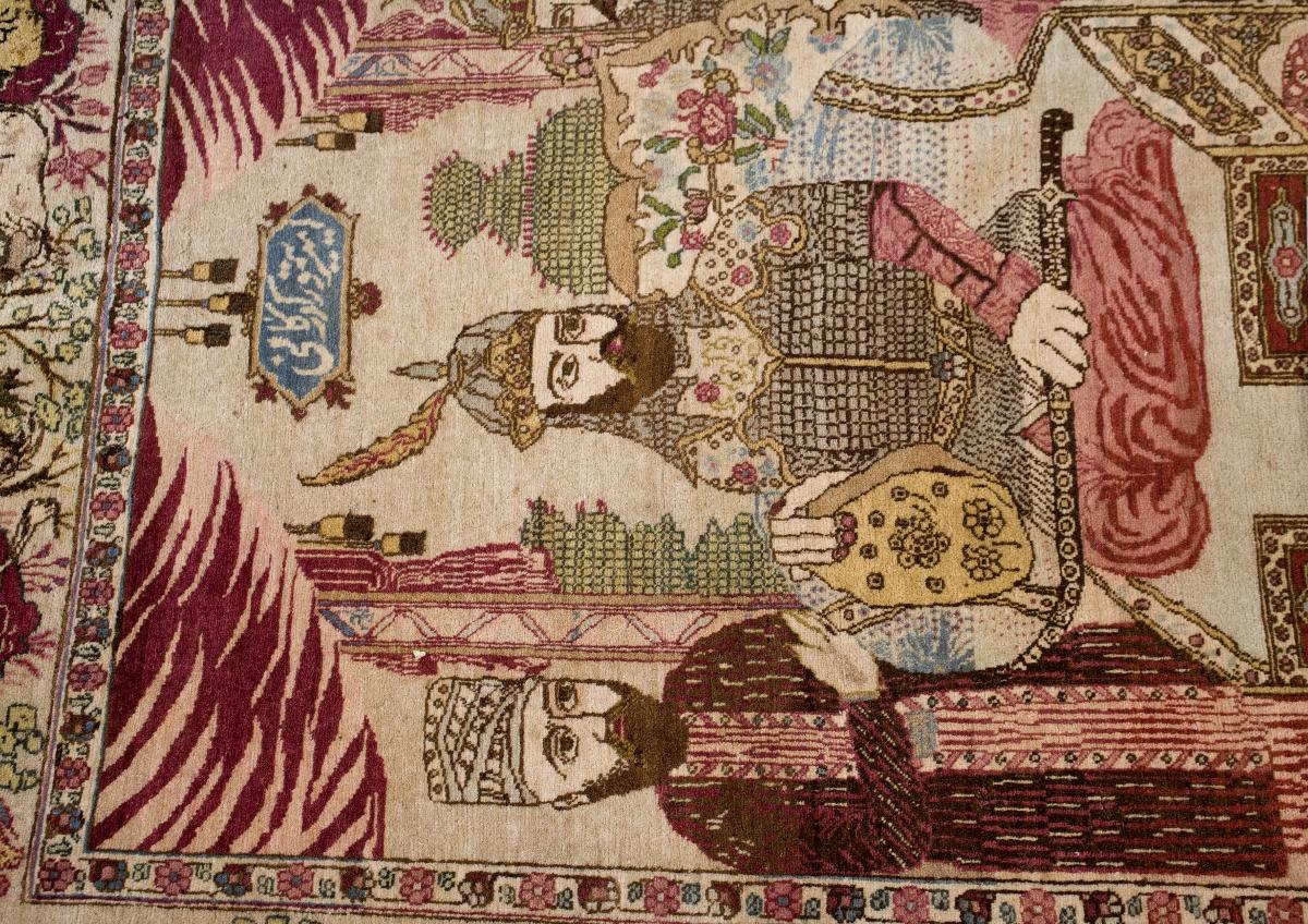 Enligt givaren: Handknuten matta från 1800-talets första hälft, bör ha hängt som väggprydnad. Motivet är överfört från persisk handskriftsillustration från sannolikt Nadir Shahs tid (1735-1747). Visar överkrigsherren sittande på trädgårdstronen, kädd för fältliv i kretsen av sina rådgivare och med hovpoeten och skildraren av shahens stordåd närvarande. Bårdens teckning går tillbaka på Safidernas tid under 1500-talet och förefaller vara en omarbetning av den s k Shah Abbasbården med aktuellt infogade husdjur. Avsikten torde vara att framhäva fredlig blomning och fruktbarhet i skydd av Shah Nadirs stora militära framgångar.