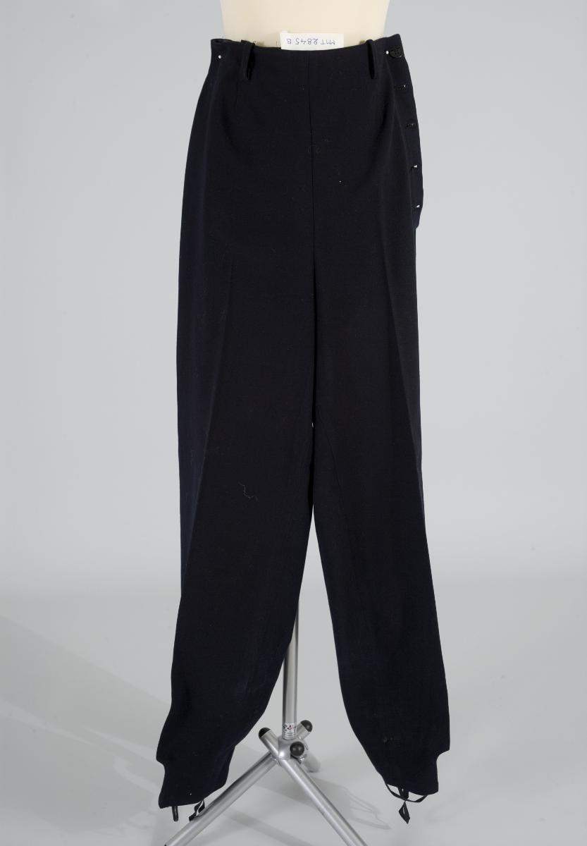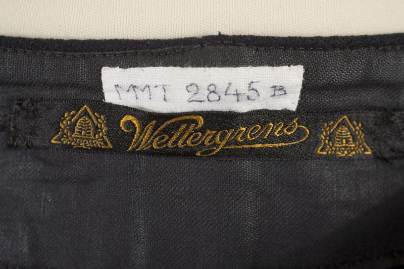 Byxor till skiddräkt av mörkblått ylletyg, vida byxor, sprund i vänster sida som knäpps med 5 knappar, 4 hällor i midjan för skärp, sprund nertill med infällda kilar och knytband, svarta resårhällor under foten. Märkt med svart etikett med gul text: Wettergrens