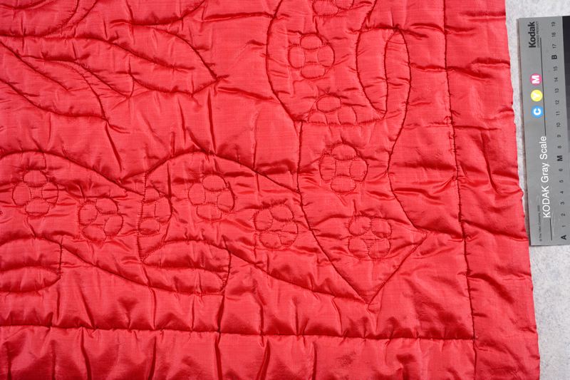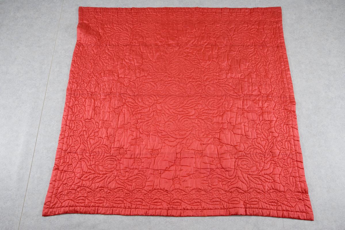 Bröllopstäcke rött siden. 1850. Sydd med sidentaft på framsidan och tättvävt bomullstyg på avigsidan. Mönstret består av små bladlika mönsterdelar, längs sidorna är bandornament sydda.