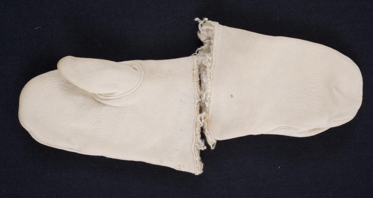 Ett par tumvantar till barn. Sydda av bomullstrikå, med flossad insida, vita. Maskinsydda.Inv. Dec. 1990 LH.