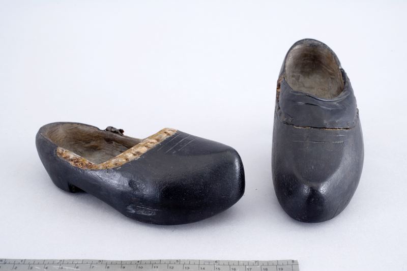 Barnträtofflor med läderskoning, svartmålade, 1880-tal. Postkontrollör Ragnar Dorn f. 1880-12-13 i Malmö var Asta Backmans fader. Inköpta på gamla torg.