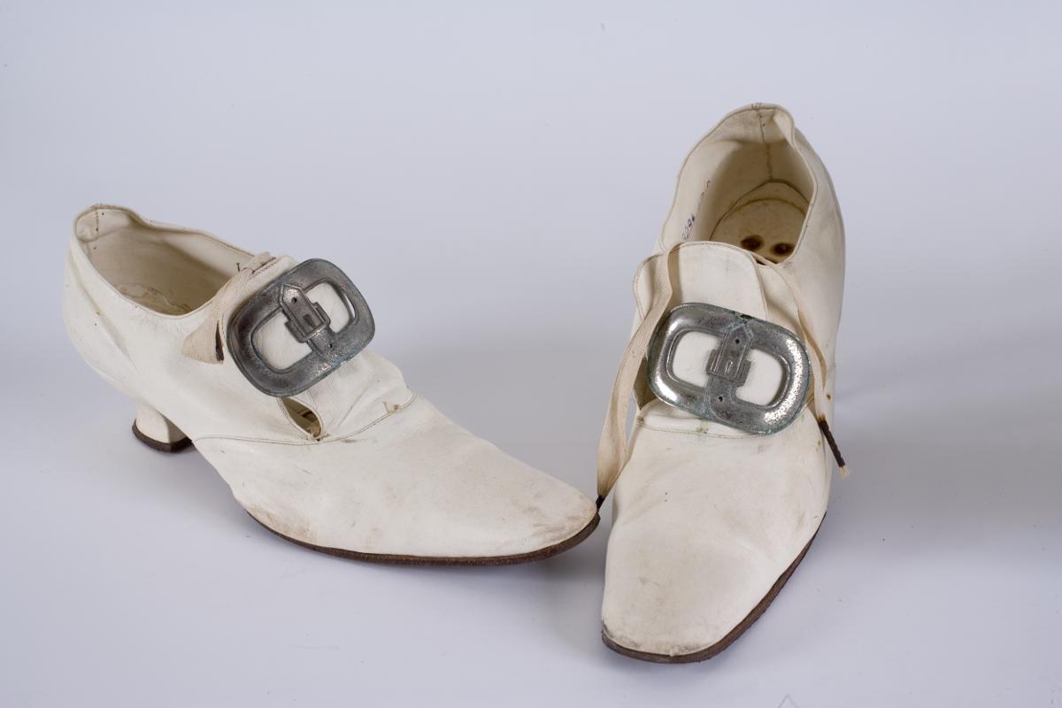 Skor, 1 par, av vitt skinn, snörda genom två snörhål. Plös med ovalt spänne av vitmetall. Klack klädd med vitt skinn. Sula av läder. Helt skinnfodrade. Inuti stämplade 1 8294 40 6. Ingår i brudutstyrsel.