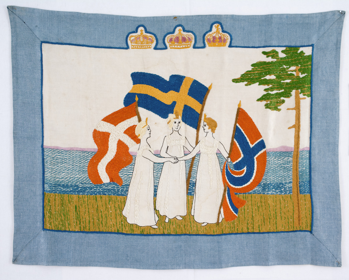 Väggbonad broderad på vitt linne med kantbård av ljusblått linne och broderier av huvudsakligen pärlgarn av bomull i många färger. Broderiet är sytt med stjälksöm, schattérsöm och plattsöm. Föreställer handslag mellan tre vitklädda gudinnor med en svensk, en dansk och en norsk fana, stående i ett landskap med en tall, hav och äng. Tre kungakronor är infällda i den övre bården.