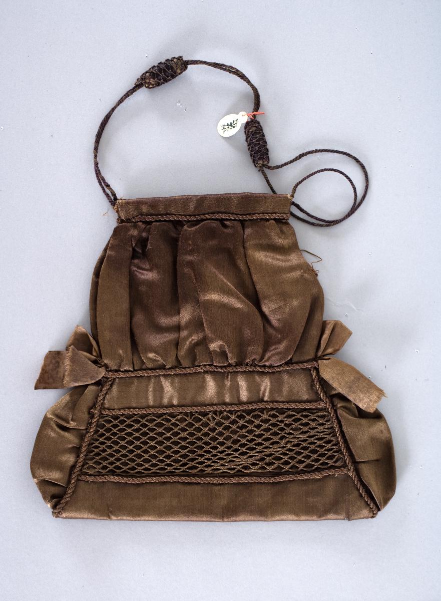 • Väska i brunt siden. Påsmodell. Handtag av silkessnoddar. Rostter i båda sidorna och på framsidan en bård av smocksömnad. Foder av brunt tunnt linne.