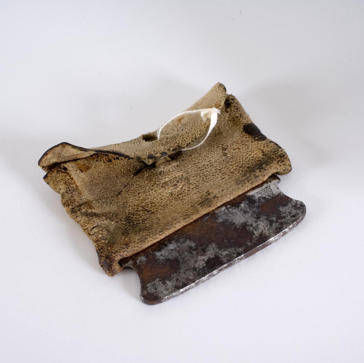 Pung för elddon i brunt skinn. Eldslagningsstål i nederkanten. Viktskinnbit och knapphål.