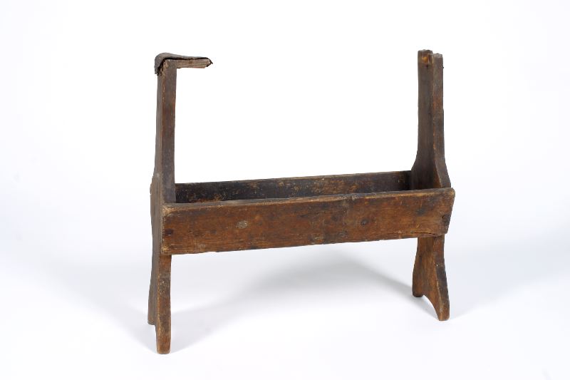 Verktygslda för hovslagare. Avlång, smal och rektangulär låda. Gavlarna förlängda nedåt som ben och uppåt som handtag. Längsgående handtag klätt med läderbitar i ändarna. Avsedd att ställas på marken. Innehåller en mängd hästskosöm och bultar. Har varit utställd i Vagnmuseet till 2005.
