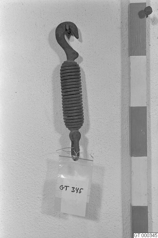 Dragkrok - stålfjäder med ögla i ena änden och krok i den andra. Förmodernare lantbruksmaskin.