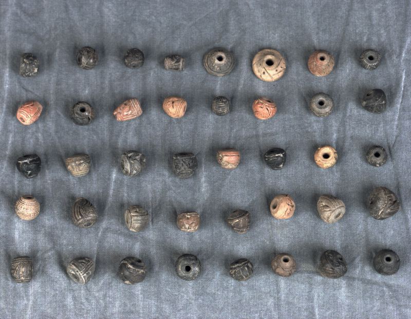 Spinntrissor 40 st.. Från Esmeraldområdet på gränsen mellan Colombia och Equador. Tillverkade av bränd lera ett 10-tal röda eller rödbruna, resten svarta eller mörkgrå. De flesta har konform med rund bas, några är helt runda. Alla har hål genom topp och bas och alla är dekorerade med djurfigurer i utkarvad relieff. Dessa är stiliserade och återkommer i samma form på flera trissor. Trissornas höjd varierar mellan 8 och 15 mm och diametern mellan 8 och 18 mm. Med största sannolikhet är denna typ av trissor gravgåvor.