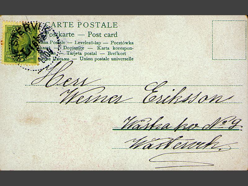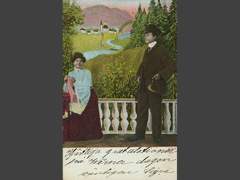 Kortets framsida. Handkolorerat fotografi föreställande en man och en kvinna. Kvinnan, som är klädd i en lång vinröd kjol och ljusblå blus, sitter till vänster vid ett bord med ett sömnadsarbete i handen. Mannen står till höger med en käpp under armen. Han är kostymklädd och bär hatt. Bakgrunden är ett målat landskap med en granskog i förgrunden. I mitten syn en by på avstånd och i fjärran syns ett berg. På kortsidan finns en i bläck handskriven text: "Hjärtliga gratulationer / på Werner dagen / vänligen Signe". Kortets baksida. Adressen handskriven i bläck: "Herr / Werner Eriksson / Wästra kv No 2 / Wästervik." Frimärket är ett grönt 5 öres Oscar II.