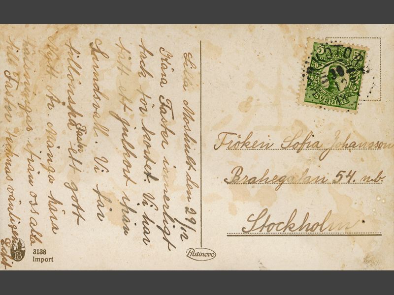 Nyårskort med motiv av en skidåkande ung kvinna (fotografi). Det snöar. Handskriven text: "Godt / nytt år". Kortet är adresserat till: "Fröken Sofia Johansson / Brahegatan 54 n.b. / Stockholm". Handskrivet meddelande: "Lilla Moshult den 29/12 / Kära Faster inerrligt / tack för kortet. Vi har / fått ett julkort ifrån / Lundsvall. Vp får / tillönska Faster ett gott / Nytt År. Många kära / hälsningar ifrån oss alla / till Faster teckans vänligen / Edit"
