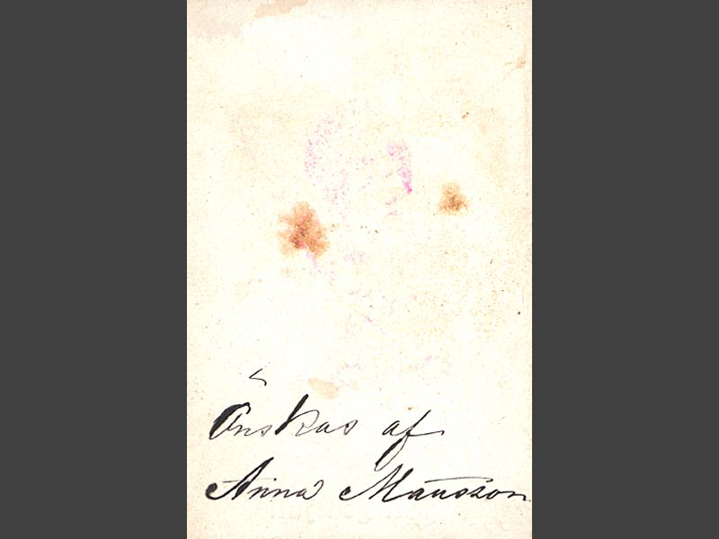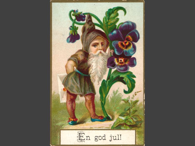 Julkort med motiv av en tomte ståendes lutandes mot en penseé. Text: "En god jul!".På baksidan handskrivet meddelande: " Önskas af / Anna Månsson".