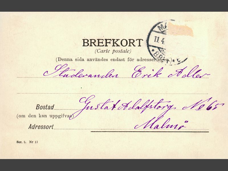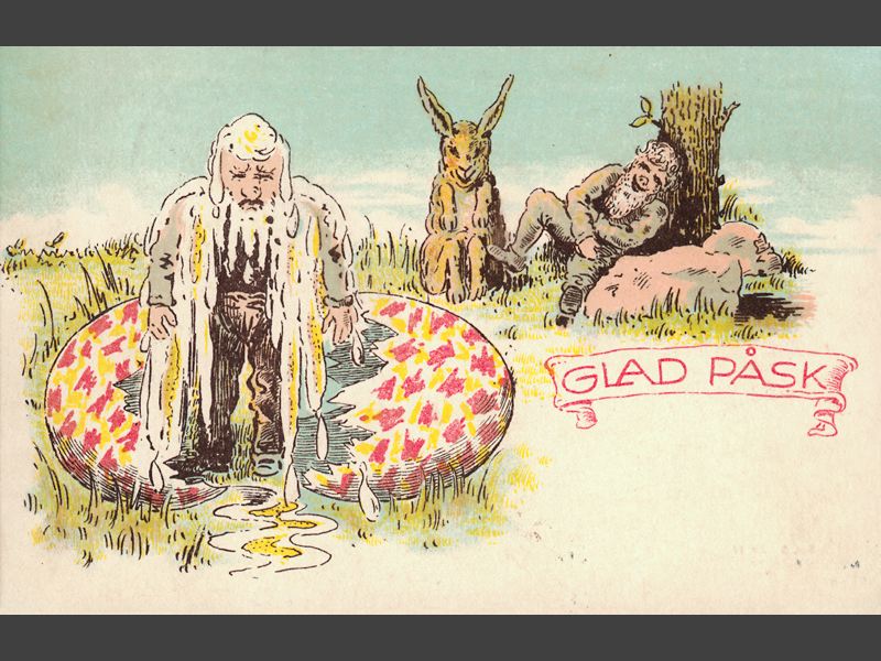 Påskkort med motiv av en tomte som fått ett stort påskägg över sig och är full med ägg-gula och vita. I bakgrunden vid ett par stenar sitter en tomte och en hare och skrattar. Text: "Glad Påsk" Kortet är adresserat till: "Erik Adler / Gustaf Adolfstorg No 65 / Malmö".