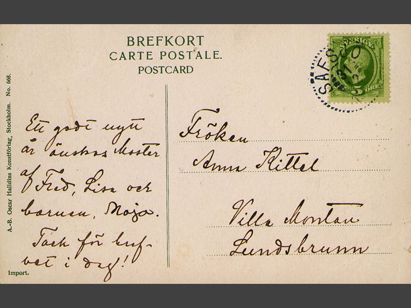 Kortets framsida. Illustration föreställande en flicka som sitter vid ett bord och skriver brev. Flickan är klädd i folkdräkt. Över bilden, omgiven av hjärtan, finns raderna "Jag önskar godt nytt år / till den, som dessa rader får". Till höger om flickan, på en gardin, är det skrivet "En / glad / jul!". Kortets baksida. Hälsningen "Ett godt nytt / år önskas Moster / af Fred, Lisa och / barnen. Maja. / Tack för bref- / vet i dag!" och adressen "Fröken / Anna Kittel / Villa Montan / Lundsbrunn" är skrivet med svart bläck. Frimärket är ett grönt femöres Oscar II i profil. Poststämplat i Säfsjö 31 / 12 / 19?.