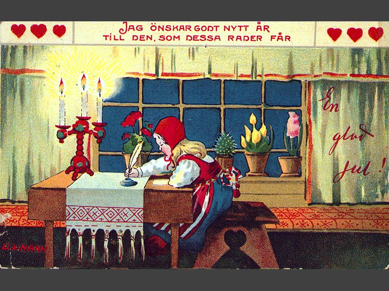 Kortets framsida. Illustration föreställande en flicka som sitter vid ett bord och skriver brev. Flickan är klädd i folkdräkt. Över bilden, omgiven av hjärtan, finns raderna "Jag önskar godt nytt år / till den, som dessa rader får". Till höger om flickan, på en gardin, är det skrivet "En / glad / jul!". Kortets baksida. Hälsningen "Ett godt nytt / år önskas Moster / af Fred, Lisa och / barnen. Maj...