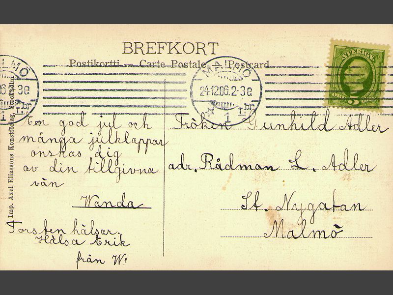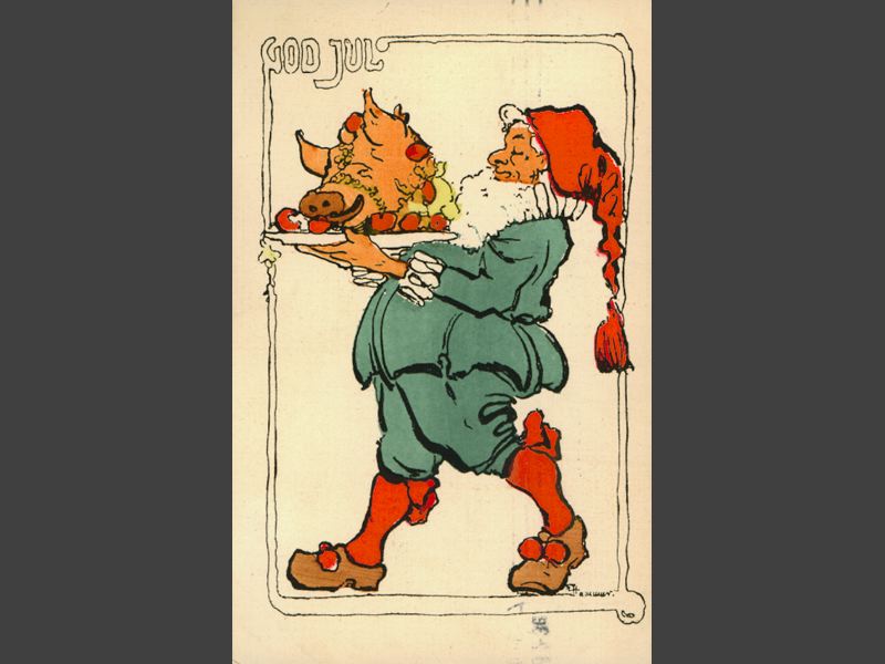 Julkort med av motiv av en jultomte som bär på ett fat med ett grishuvud. Text: "God Jul". Kortet är adresserat till: "Fröken Gunhild Adler / adr. Rådman L. Adler / St. Nygatan / Malmö. Handskriven hälsning: "En god jul och / många julklappar / önskas dig / av din tillgivna / vän / Wanda / Torsten hälsar / Hälsa Erik / från W."