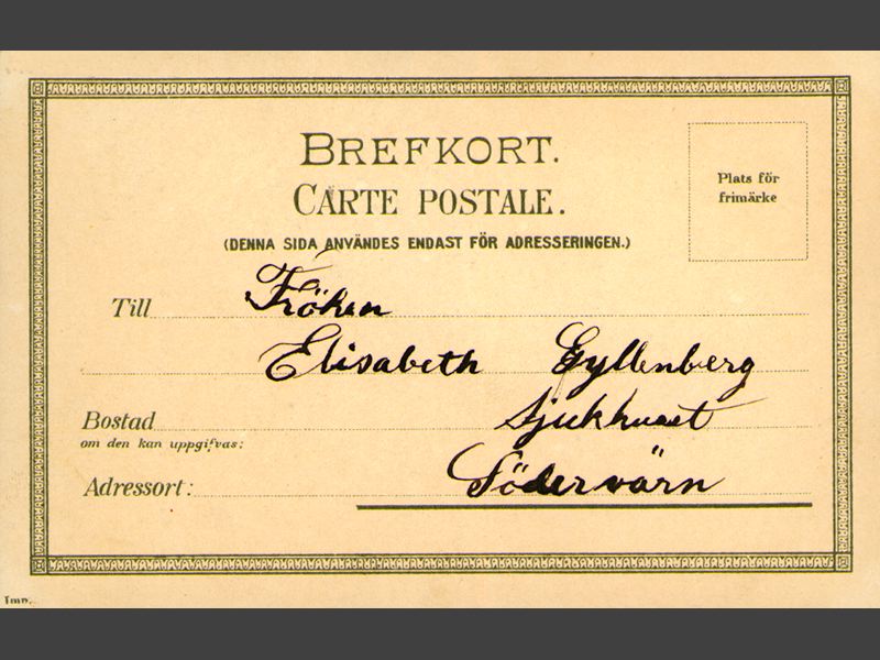 Kortets framsida. Kolorerat fotografi föreställande en kvinna i folkdräkt från Blekinge. Under bilden finns "Blekinge" tryckt i rött och en handskriven hälsning "Hälsningar ifrån Hilma / på födelsedagen". Kortets baksida. Tryckt text "BREFKORT. / CARTE POSTALE. / (DENNA SIDA ANVÄNDES ENDAST FÖR ADRESSERINGEN.)" Adressen handskriven "Fröken / Elisabeth Gyllenberg / sjukhuset / Södervärn".