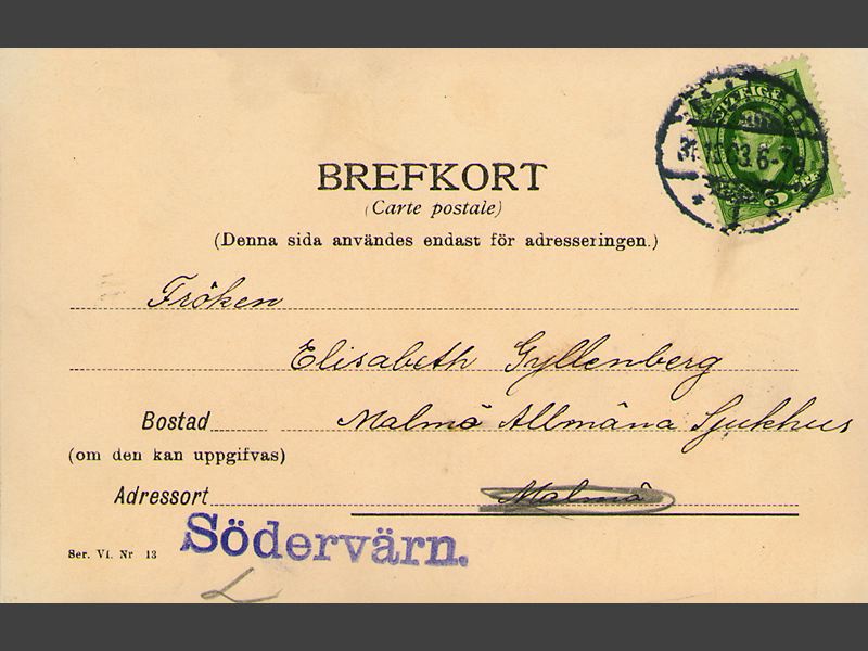 Kortets framsida. Illustration föreställande en tomtenisse som sitter på en snöklädd sten och blåser i något som liknar en trumpet. På stenen finns målat "Godt nytt år!". Under bilden finns en handskriven hälsning "tillönskas dig af / Emmy o Bertha". Kortets baksida. "BREFKORT / (Carte postale) / (Denna sida användes endast för adresseringen.)" finns tryckt ovanför den handskrivna adressen "Fröken / Elisabeth Gyllenberg / Malmö Allmänna Sjukhus / Malmö". Ortsangivelsen Malmö är överstruket med blyerts och undertill finns "Södervärn." stämplat i blått. Frimärket är ett grönt femöres Oscar II i profil, poststämplat i Malmö 31.12.03.6-7e.