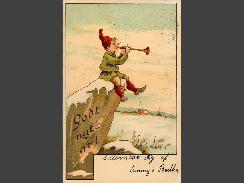 Kortets framsida. Illustration föreställande en tomtenisse som sitter på en snöklädd sten och blåser i något som liknar en trumpet. På stenen finns målat "Godt nytt år!". Under bilden finns en handskriven hälsning "tillönskas dig af / Emmy o Bertha". Kortets baksida. "BREFKORT / (Carte postale) / (Denna sida användes endast för adresseringen.)" finns tryckt ovanför den handskrivna adressen "Fröken...