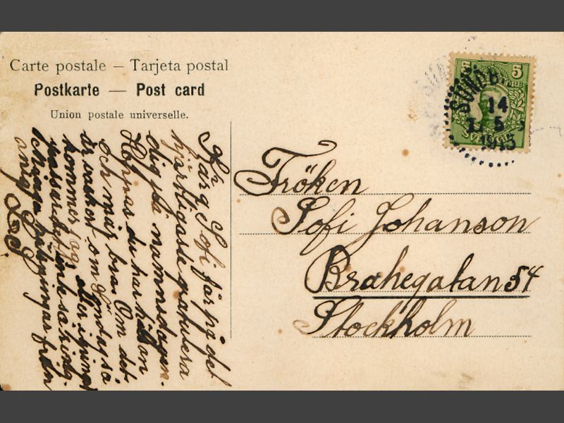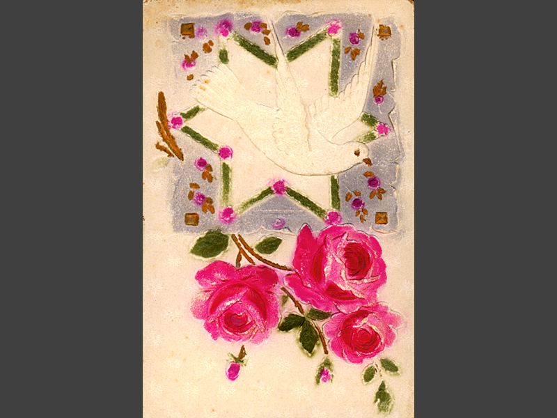Kortets framsida. Sidenöverdraget relieftryck. Vit duva i flykt tillsammans med tre röda rosor. Kortets baksida. Handskriven hälsning "Kära Sofi får på det / hjärtligaste gratulera / dig på namnsdagen. / Hoppas du har hälsan / och mår bra. Om det / är vackert om Söndag så / kommer jag eller i pingst / passar det inte så ring. / Många hälsningar från mig LS." Adressen handskriven "Fröken / Sofi Johanson / Brahegatan 54 / Stockholm". Frimärket är ett grönt femöres Gusat V, oläslig poststämpel.
