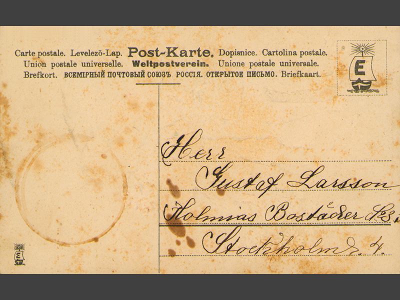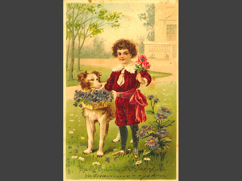Kortets framsida. Illustration föreställande ett litet barn med röd ros i handen. Till höger om barnet står en hund med en korg i munnen, vilken är fylld med blå blommor. I kortets nederkant finns en tryckt text "Hjärtlig Gratulation på Gustaf dagen / från mamma å syskon" där namnet och gratulanterna är handskrivna. Kortets baksida. Adressen handskriven "Herr / Gustaf Larsson / Holmia Bostäder No 3. / Stockholm 4."