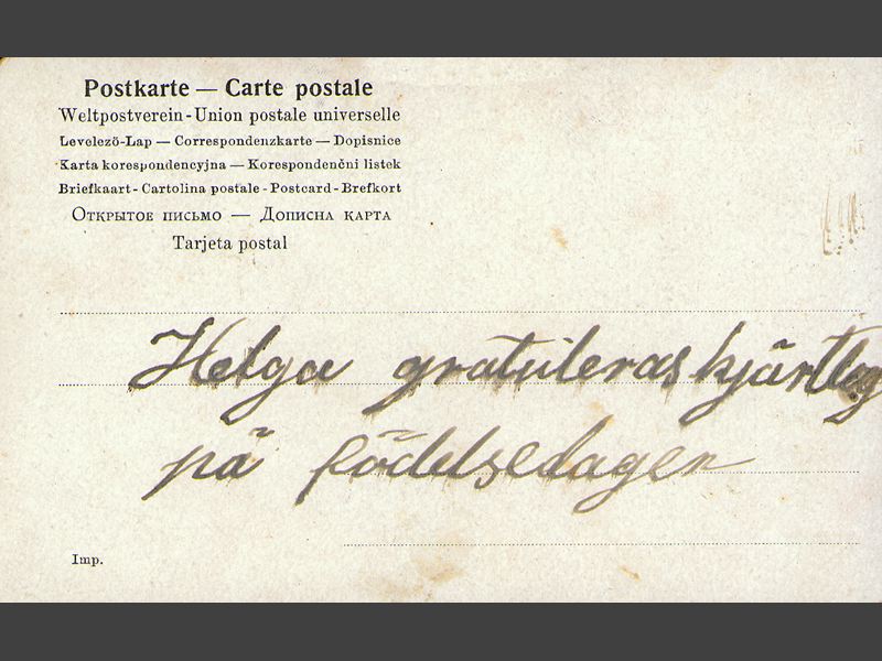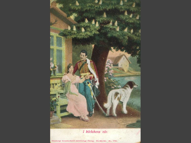 Gratulationskort med motiv av en kvinna sittandes på en bänk under ett kastanjeträd. Bredvid henne står en man klädd i uniform. Bredvid paret står en stor hund (Sankt Bernhard?). Rubriken på motivet är "Kärlekens vår". Handskriven hälsning på baksidan: "Helga gratuleras hjärtligt / på födelsedagen".