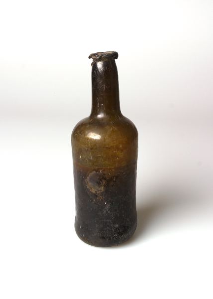 Vinflaska med vin i. Upptagen från ett utanför Anholt sjunket danskt fartyg, som var på väg till Tranquebar i Ostindien, något av åren 1779-1780. Upptagen 1910 av konservator Muehardt. Samtidigt togs en kanon märkt 1764 upp.