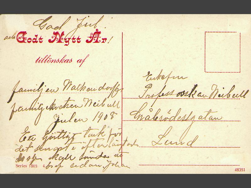 Kortets baksida: Adresserat till "Enkefru/ Professorskan Weibull/ Gråbrödersgatan/ Lund". "God Jul / och (tryckt) Godt Nytt År! (handskr.) / (tryckt) tillönskas af/ (handskr.) familjen Wolendorff/ familjekretsen Weibull/ Julen 1908/ Ett hjärtligt tack för/ det senaste öfterlängtade/ bref skall sända ett/ bref sedan. Johan". Handskrift är i bläck. I nedre vänstra hörnet "Series 1803 4". I själva nedersta hörnet, höger : "48351".