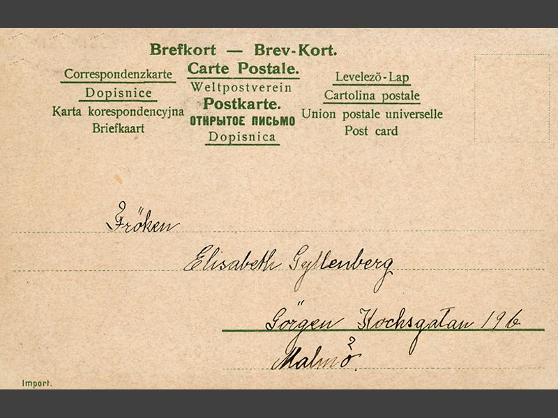 Kortets framsida: Skånskt landskap, betesmark med kor. Under bilden, tryckt: " Från Sveriges Bygder, Skåne." Handskriven hälsning, i bläck: " Elisabeth gratuleras på födelsedagen den 31/3 04 af/ Mamma". Undertill, tryckt: "Axel Eliassons Konstförlag, Stockholm No. 3345." Baksidan: "Brefkort - Brev-Kort" och samma skrivet på några olika språk. Nedersta vänstra hörnet: "Import.", tryckt. Adresserat (handskrift, i bläck): " Fröken/ Elisabeth Gyllenberg/ Görgen Kocksgatan 19b/ Malmö"