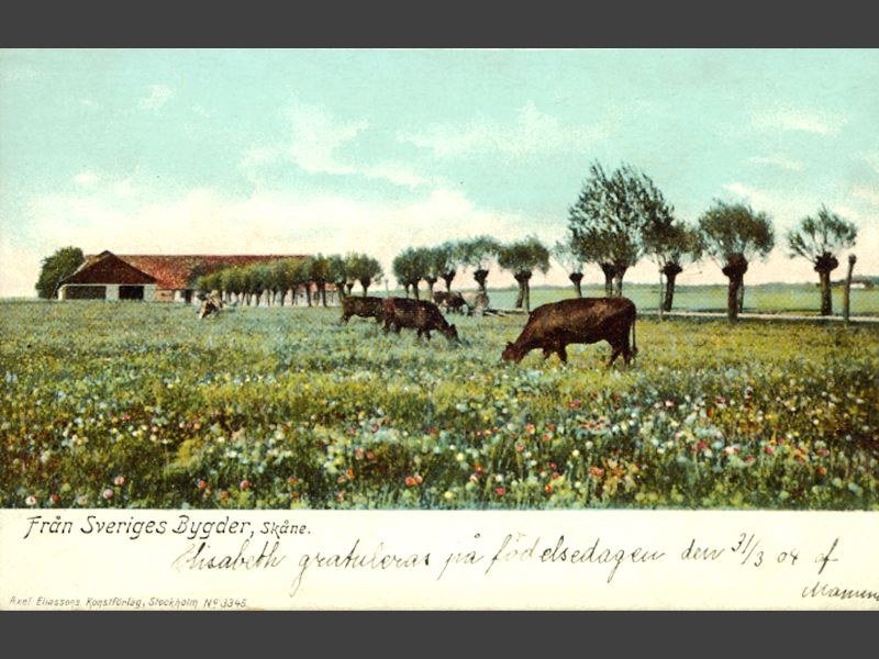 Kortets framsida: Skånskt landskap, betesmark med kor. Under bilden, tryckt: " Från Sveriges Bygder, Skåne." Handskriven hälsning, i bläck: " Elisabeth gratuleras på födelsedagen den 31/3 04 af/ Mamma". Undertill, tryckt: "Axel Eliassons Konstförlag, Stockholm No. 3345." Baksidan: "Brefkort - Brev-Kort" och samma skrivet på några olika språk. Nedersta vänstra hörnet: "Import.", tryckt. Adresser...