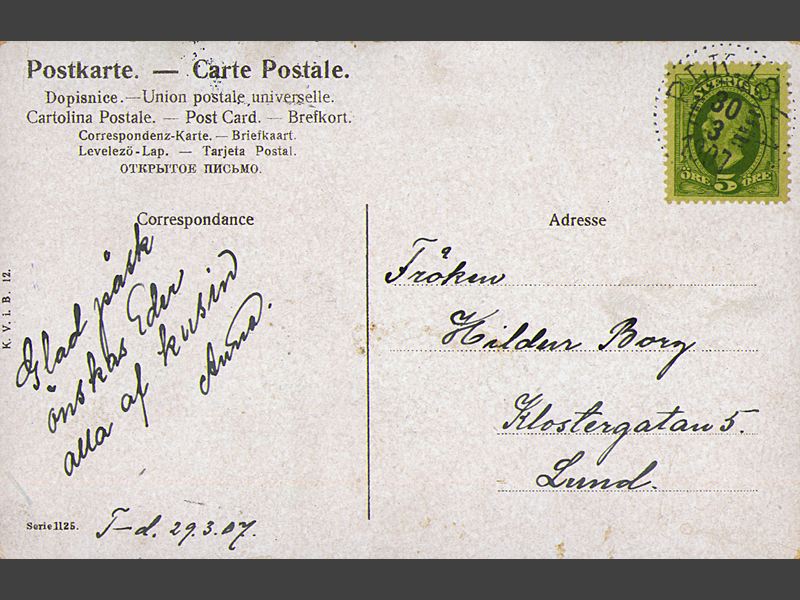 Påskkort föreställande en ung välklädd fru, skjutande en blomsterprydd skottkärra full med påskägg av olika storlekar, i blå, vit och gul. Framför damen går en liten flicka, som låtsas dra i skottkärran, med hjälp av två blå band. Kortets baksida : "brevkort" på några olika språk, undertill "Correspondance" "Adresse" (på högra sidan), "Serie 1125" i nedre vänstra hörnet. Adresserat, handskrivet, till " Fröken/ Hildur Borg/ Klostergatan 5/ Lund". "Glad påsk/ önskas Eder/ alla af kusin/ Anna." Längs vänstra nedre kanten "T-d. 29.3.07." Vid vänstra sidan: "K.V.i.B.12.", tryckt.