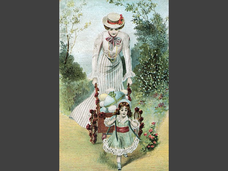 Påskkort föreställande en ung välklädd fru, skjutande en blomsterprydd skottkärra full med påskägg av olika storlekar, i blå, vit och gul. Framför damen går en liten flicka, som låtsas dra i skottkärran, med hjälp av två blå band. Kortets baksida : "brevkort" på några olika språk, undertill "Correspondance" "Adresse" (på högra sidan), "Serie 1125" i nedre vänstra hörnet. Adresserat, handskrivet, ...