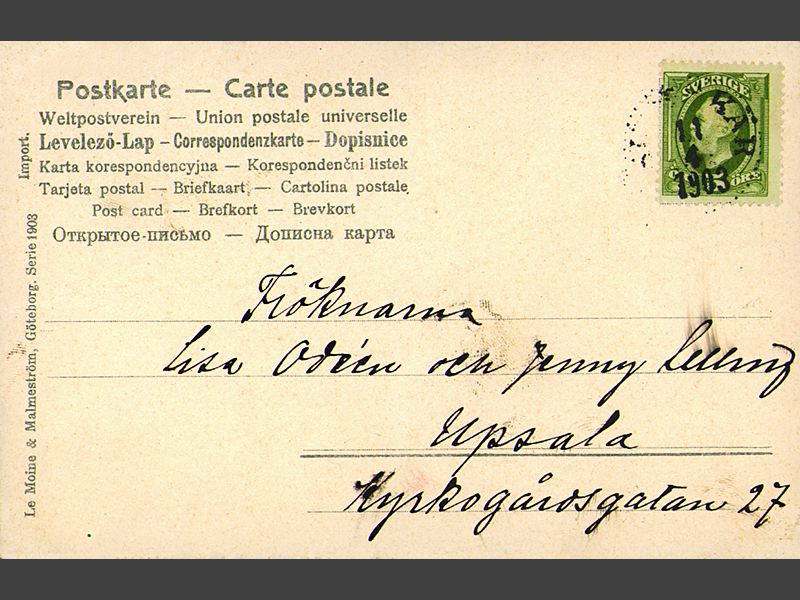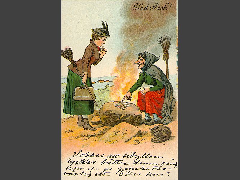 Påskkort föreställande en gammalmodig och en ung "modemedveten" häxa, båda med sin häxkvast. Den gamla spående i kort till den yngre. Under bilden handskrivet i bläck: " Hoppas, att sibyllan/ lyckas bättre denna gång,/ hon ser ju ganska tro-/ värdig ut. Eller hur?" Ovan, till höger, tryckt i kursiv "Glad Påsk!". Kortets baksida: "Brevkort" på några olika språk. Längs vänstra kanten tryckt: " Le Moine & Malmeström, Göteborg. Serie 1903. Import." Adresserat, handskrivet, till "Fröknarna/ Lisa Odéen och Jenny ..(oläsligt)./ Upsala/ Kyrkogårdsgatan 27".