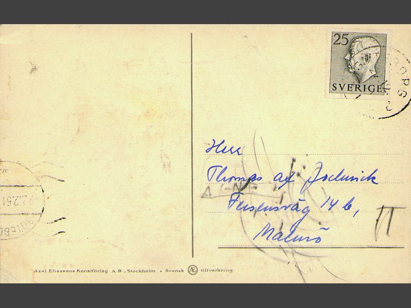 Kortets baksida: Frankerat med ett grått svenskt frimärke, valör 24, poststämplat i Göteborg, stämpeln otydlig. Längs nedre vänstra ka...