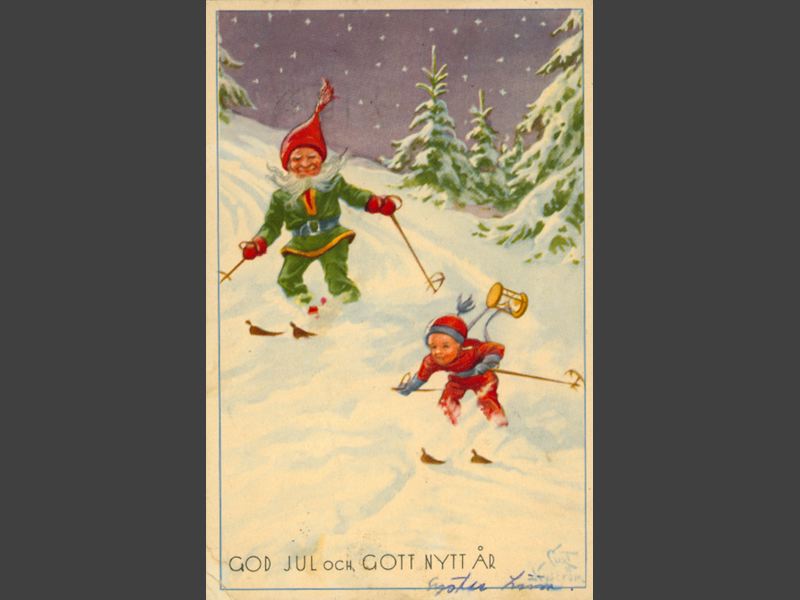 • Curt Nyströms kort föreställande en jultomte och en pojke i en skidfärd nerför en skogsbacke. Längs nedre kanten av kortet tryckt "GOD JUL och GOTT NYTT ÅR", i själva nedre högra hörnet "Curt/Nyström". Handskrivet, bläck: "syster Liisa" (underskrift diskutabel).