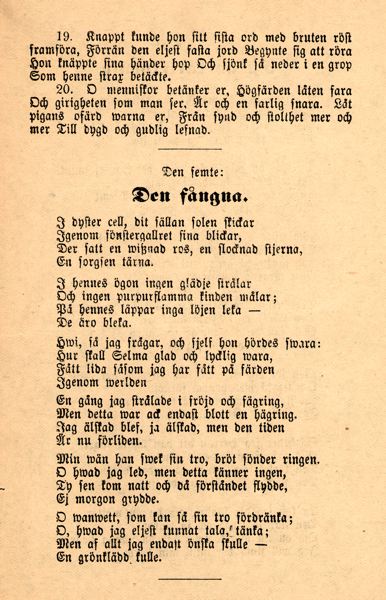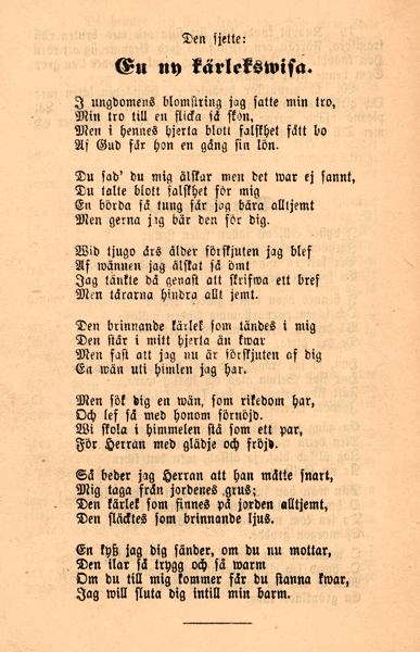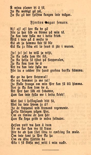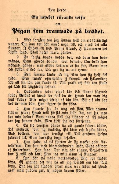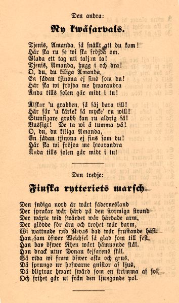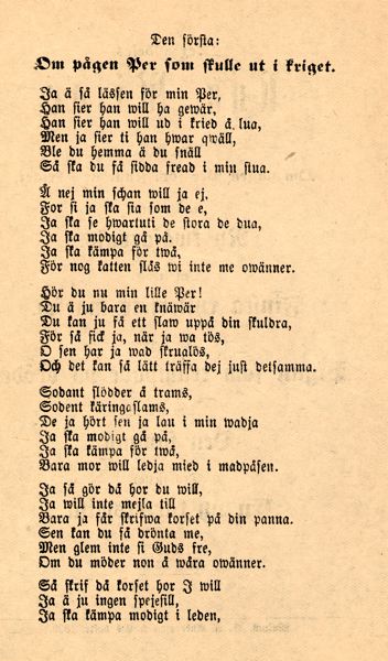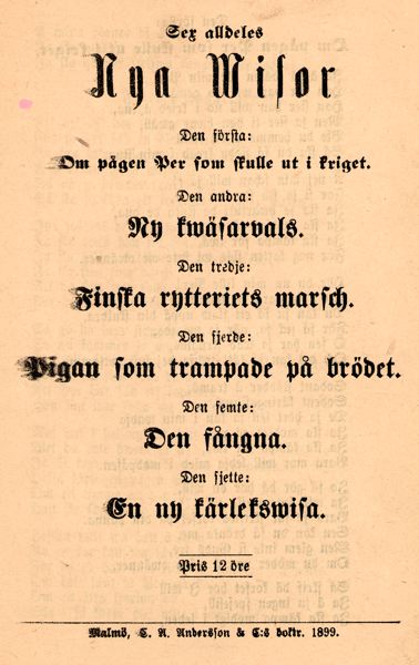 Den första: Om pågen Per som skulle ut i kriget. Den andra: Ny kwäsarevals. Den tredje: Finska rytteriets marsch. Den fjerde: Pigan som trampade på brödet. Den femte: Den fångna. Den sjette: En ny kärlekswisa.