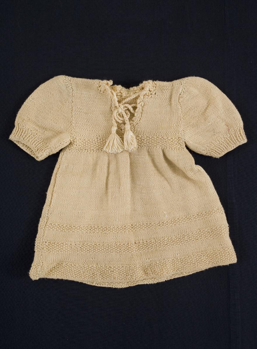 Barnklänning stickad i silkegarn. Kort ärm med stickad resår. Mönsterstickade bårder nedtill . En bård upptill. I halsen liten snodd av garn genom virkad kant.