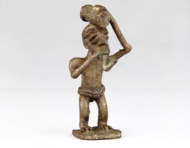 Stående figur av brons. Han har en rökpipa i munnen som han håller med höger hand. På huvudet har han en tunnliknande cylinder (trumma), som han håller med vänster hand.