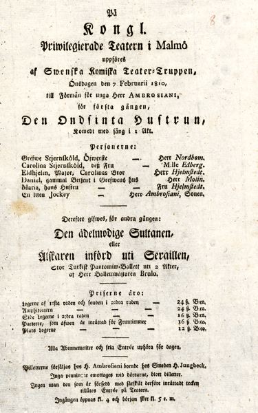 Teateraffisch. Föreställning vid Malmö Teater onsdagen den 7 februari 1810 till förmån för unga herr Ambrosiani. Svenska Komiska Teatertruppen under Brulo och Ambrosiani ger komedin Den Ondsinta Hustrun och turkiska pantomimbaletten Den ädelmodige Sultanen. Teatern benämns på affischen Kongl. Priwilegierade Teatern i Malmö. Malmö Förskönings- och Planteringsförening inköpte samlingen MHM 012651...
