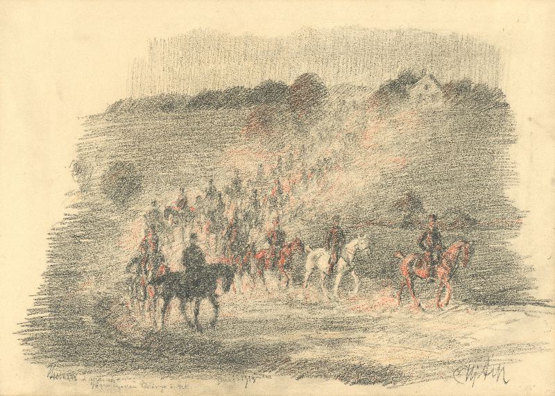 Bilden visar en trupp ridande soldater. I bakgrunden ett hus och buskar.