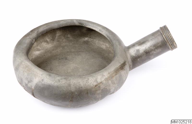 Bäcken av tenn, runt, med bukiga sidor och invikt kant. På bottnens undersida inristade koncentriska cirklar. Märkt med graverad inskrift under botten: A. Norström.
