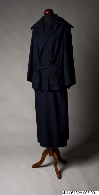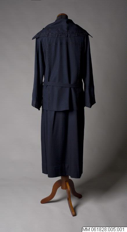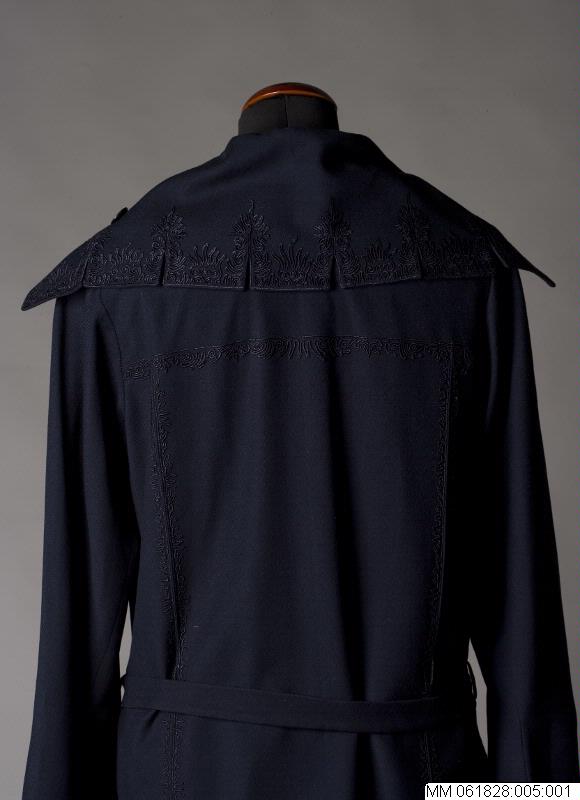 Jacka med stor liggande krage avslutad nedtill i flikar med bandbroderier.Ärmaavslut i flikar med broderier. Påsydda påsfickor med broderier och rynkat parti. I ryggen ok och broderade partier.Skärp på höften. Foder saknas. I fickan lös textiletikett Meeths STOCKHOLM.