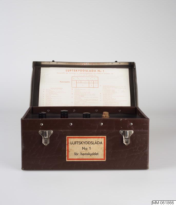 "Luftskyddslåda N:o 1 för hemskyddet. Sammanställd efter anvisningar av Luftskyddsinspektionen och avsedd för fastigheter, där mindre än 50 personer bo". Innehållssförteckning på lockets insida. Enligt förteckningen saknas en del av innehållet. Innehåller 2012-01-24 är: 1 st brun tom glasflaska till natriumbikarbonatlösning 3%. 1 st brun tom glasflaska till kloraminlösning 1%. 1 st brun tom glasf...