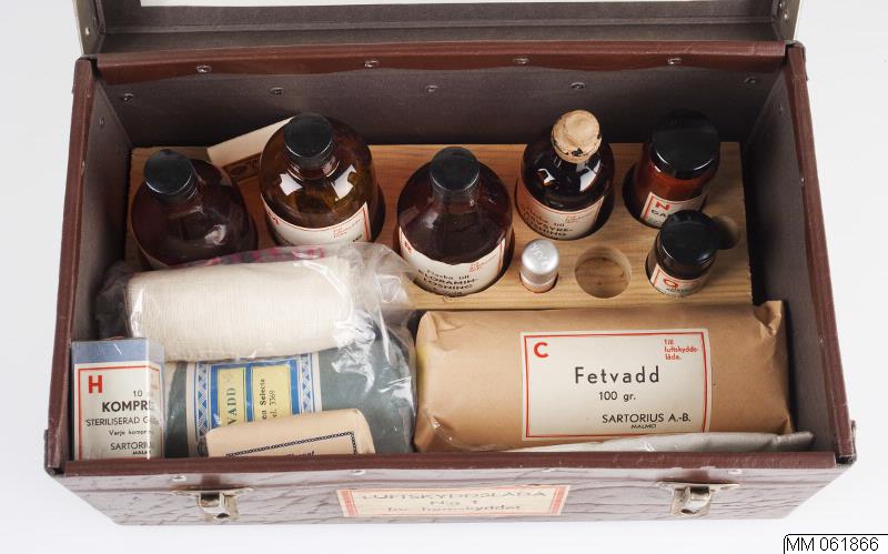 "Luftskyddslåda N:o 1 för hemskyddet. Sammanställd efter anvisningar av Luftskyddsinspektionen och avsedd för fastigheter, där mindre än 50 personer bo". Innehållssförteckning på lockets insida. Enligt förteckningen saknas en del av innehållet. Innehåller 2012-01-24 är: 1 st brun tom glasflaska till natriumbikarbonatlösning 3%. 1 st brun tom glasflaska till kloraminlösning 1%. 1 st brun tom glasflaska till borsyrelösning 2%. 1 st brun tom glasflaska till garvsyrelösning 2,5%. 1 st brun glasburk innehållande garvsyra 15 gr. 1 st brun glasburk innehållande natriumbikarbonat 30 gr. 1 st liten behållare innehållande jodsprit 5%. 1 st liten ask innehållande "The Globe" säkerhetsnålar. 1 st oöppnad påse med "kemisk ren gas 1 meter x 60 cm". 1 st oöppnad ask " 10 st kompresser steriliserad gas 0x10 cm". 1 st oöppnad förpackning "Steriliserat första förband 5 meter x 7 cm". 1 st oöppnad förpackning "fetvadd 100 gr.". 1 st öppnad förpackning "cellulosavadd" från Lund. 1 st vit gasbinda med tygetikett med texten Gustaf Nilsson, Klostergatan 5, Lund.