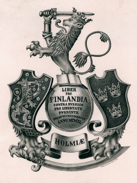 • Svart tryck på vitt papper. Vapen. Text: Liber pro Finlandia contra Russiam pro libertate pugnante Donatus Venum Datus ANNO MCMXL HOLMIAE